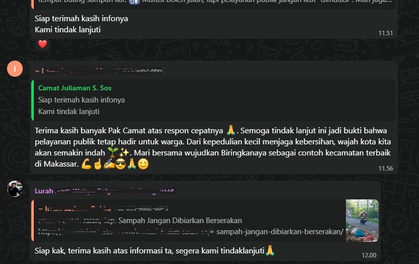 Kurang dari 10 menit, Camat Biringkanaya merespon cepat info tersebut dan langsung berkoordinasi dengan Satgas Kebersihan turun ke Lokasi. Kamis 18/09/2025